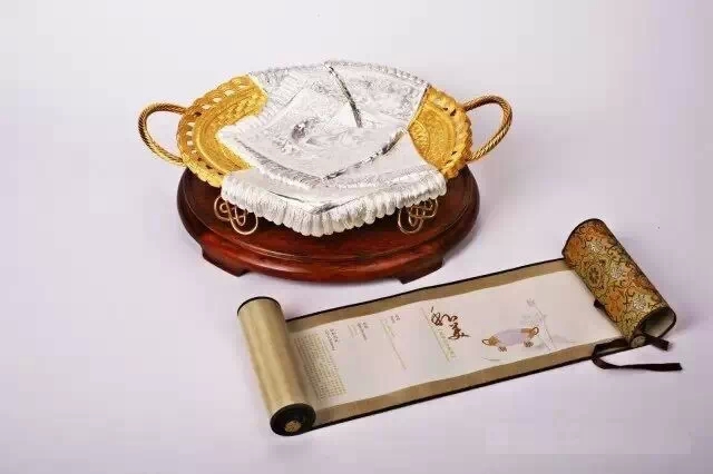 《和美》純銀絲巾果盤造型來源于中國傳統的竹編果籃,其上披一條柔軟的江南絲巾,四足則為由銀絲編制的具有中國特色的中國結造型。千錘百煉制造出這栩栩如生的效果,東方匠人用自己出神入化的手工技藝,令21世紀的偉大發明3D打印技術相形見絀。這果盤是由整塊足銀材料經過上千萬次的純手工鏨刻而成。此件作品由中國工藝美術大師純手工制作,造型逼真、鏨刻細膩。精美絕倫之處更在于它以貴金屬材質展現出了絲綢的質感,尤其是絲巾細節之處的縷縷絲線和竹籃的藤條肌理效果的處理,既凸顯了絲巾的柔軟與細膩,又展現了竹籃的古樸與自然的視覺感受,是中國傳統鏨刻工藝作品中的一件藝術精品。